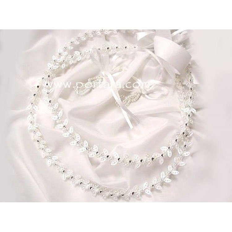 Crowns are connected by long white satin ribbon.