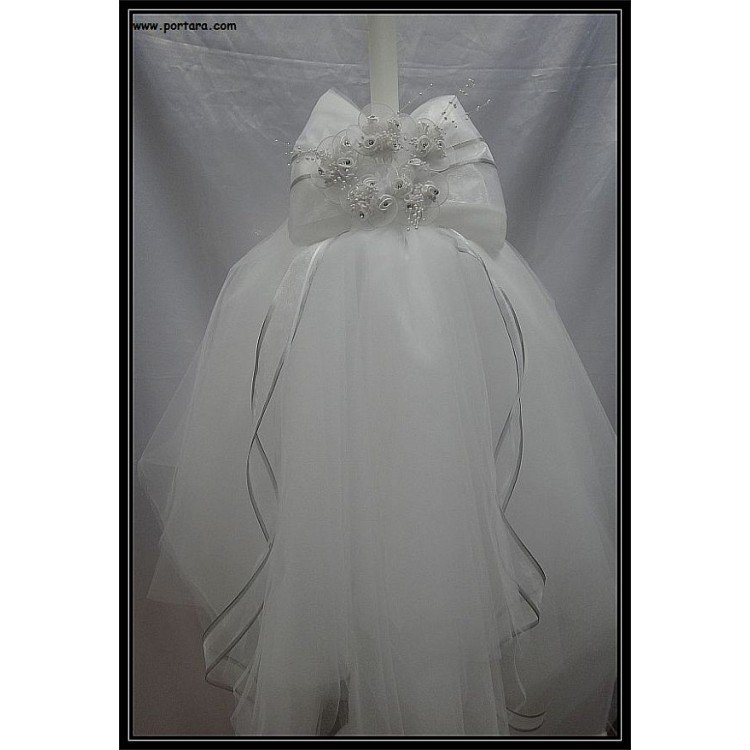 This is a gorgeous pair of wedding candles with exquisite beauty and appearance. They are wedding candles that stand out immediately with their simplicity and design. Each candle is made of several layers of soft white or ivory color tulle coming down in uneven ends to give a full look as it shows. The top of the candle is adorned with a white bow surrounded with white or ivory color organza fabric and its center is decorated with an arrangement of white flowers with crystal centers and matching pearl spray. White wide organdy ribbons with Silver satin edges accented the body of the candle further.