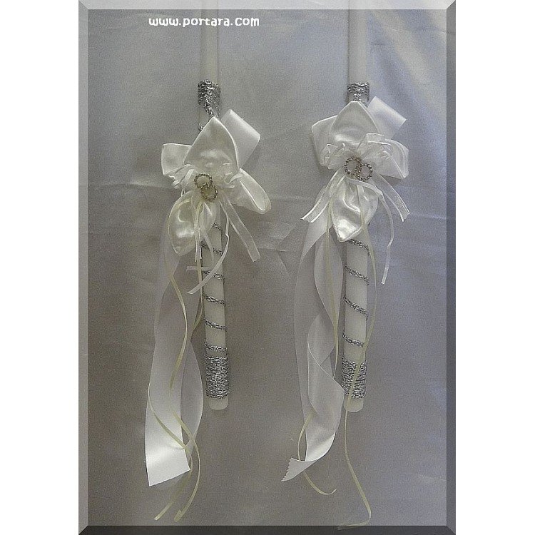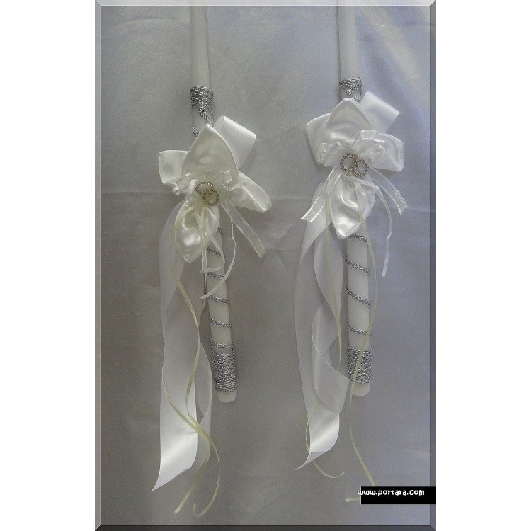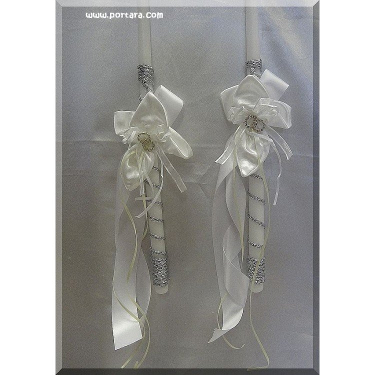 Shown candles are made with silver rope, white wide silky satin ribbon and thin ivory silky satin ribbon. Ribbons are available in many colors. Please select your choices from our list below.