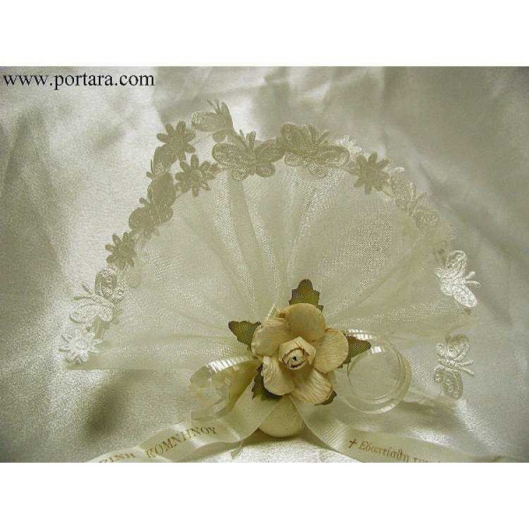 This is a high quality pure organdy circle having ivory color and its border has lovely silky satin butterflies design all around. It is filled with five fine almonds and it is decorated with a large matching ivory color flower in the center. Personalized imprinted ribbon is included in the price.