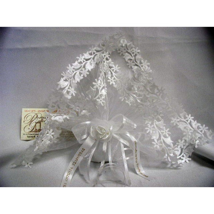 This is a fine quality bomboniere made of pure Italian white organdy fabric with wide embroidered endings all around. It is filled with 5 sugared almonds and embelished further with matching white organdy ribbons with satin edges and a beautiful large flower in the center.