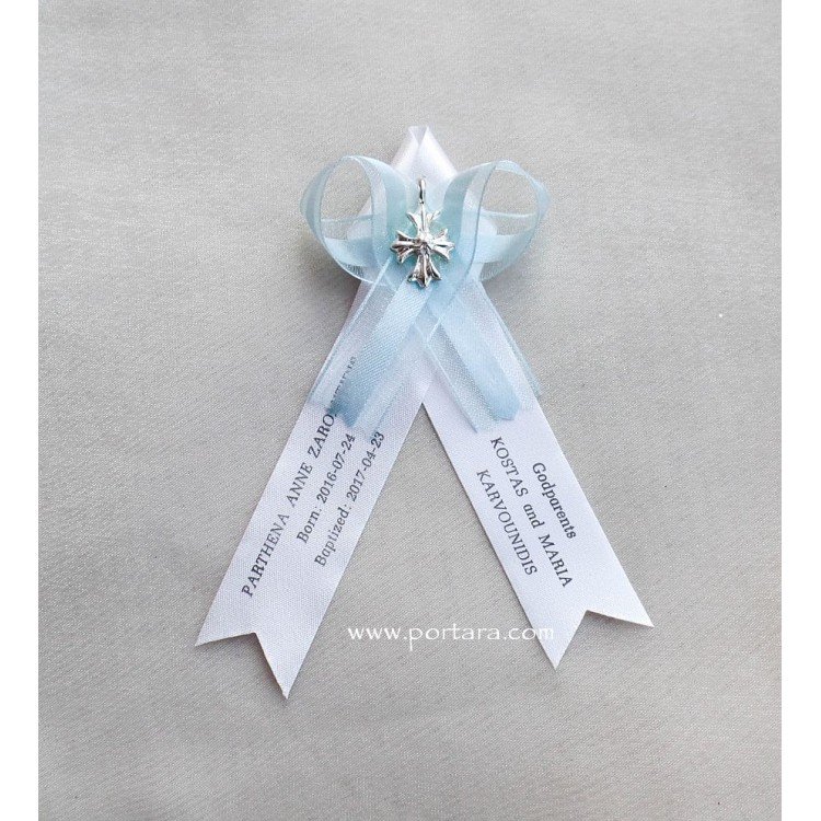 Martirika made by satin ribbons, a sheer organdy bow with satin center and an imported silver plated cross in the center. Very cute, exquisite and delicate for either