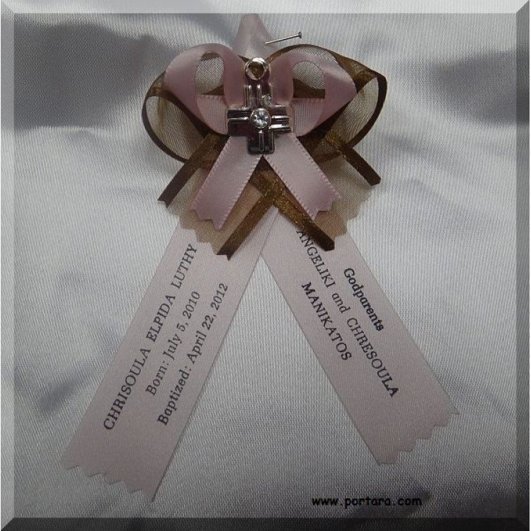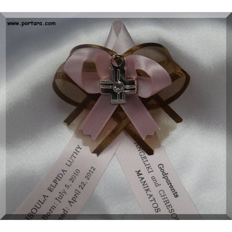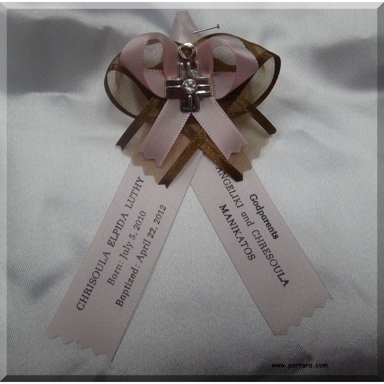 Martirika made by a high-quality brown organdy ribbon with satin edges on the bottom and another pink satin ribbon on the top of it. A silver cross with Swarovski gemstone center is attached in the center. Very elegant color Martirika that will draw anyone's attention with their unique beauty and quality. Placed in a basket with the biggest pieces for the parents and the Godparent(s). If you prefer them on a decorative satin pillow, please choose one from our list.