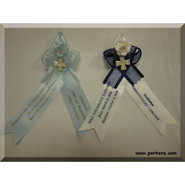 Martirika made by satin ribbon and an imported silver cross with ecrou (off white) enamel center on a light blue or royal blue sheer organza bow with satin edges. A unique matching flower in baby blue or pastel ivory color decorates the top of the cross.