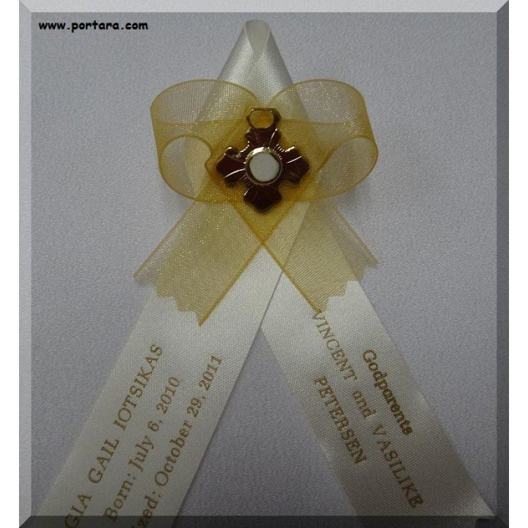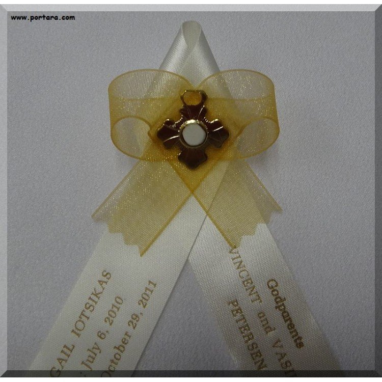 Martyrika made by satin ribbon, a double color organdie bow of earth colors and a gold cross with white enamel in the center. Suitable for either a girl's or a boy's Christening. Placed in a basket with the biggest pieces for the parents and the Godparent(s). If you prefer them on a decorative satin heart shaped pillow or a cross-shaped pillow, please choose one from our list.