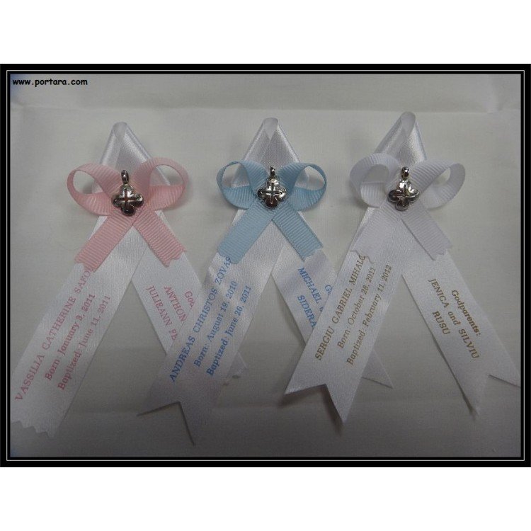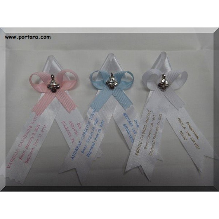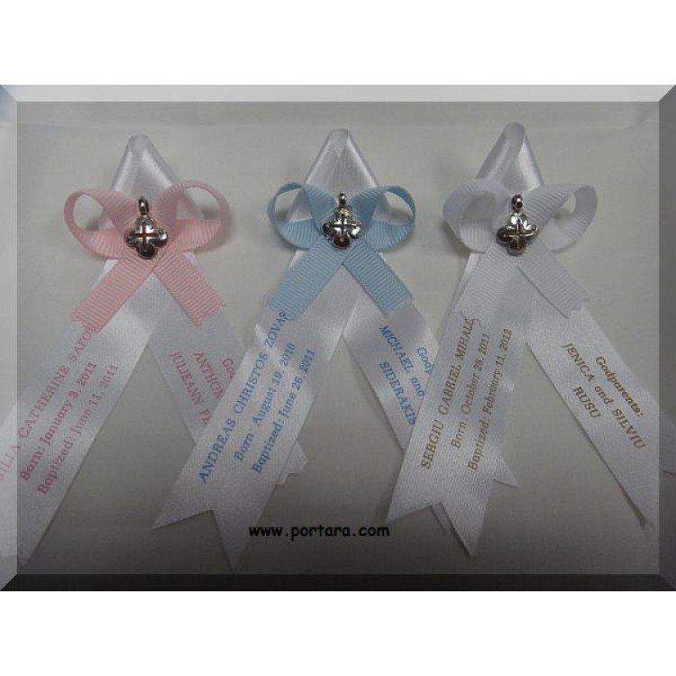 This is a very dainty silver cross that stands on top of a baby blue grosgrain bow of 3/8" width. The price includes special ribbons for parents and godparent(s) and packaged in a basket for easy handling. If you want the pins on a decorative pillow, please choose one from our list.