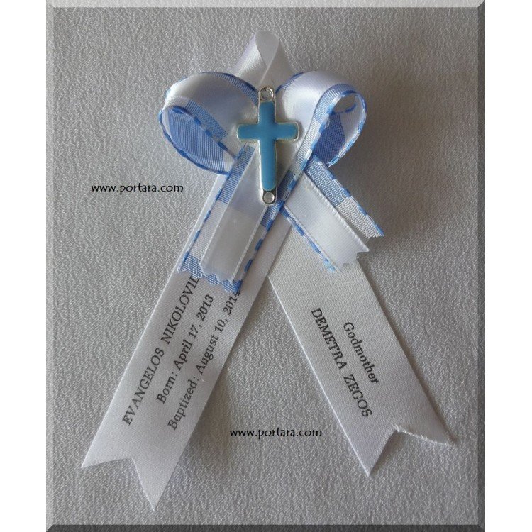 Witness pins - Martyrika are small lapel ribbons handed out at the end of the ceremony and worn by guests as proof of witnessing the baptism. The godparent(s) pin the martyrika onto guests who witness the baptism at either the end of the church service in the narthex of the church or at the reception.