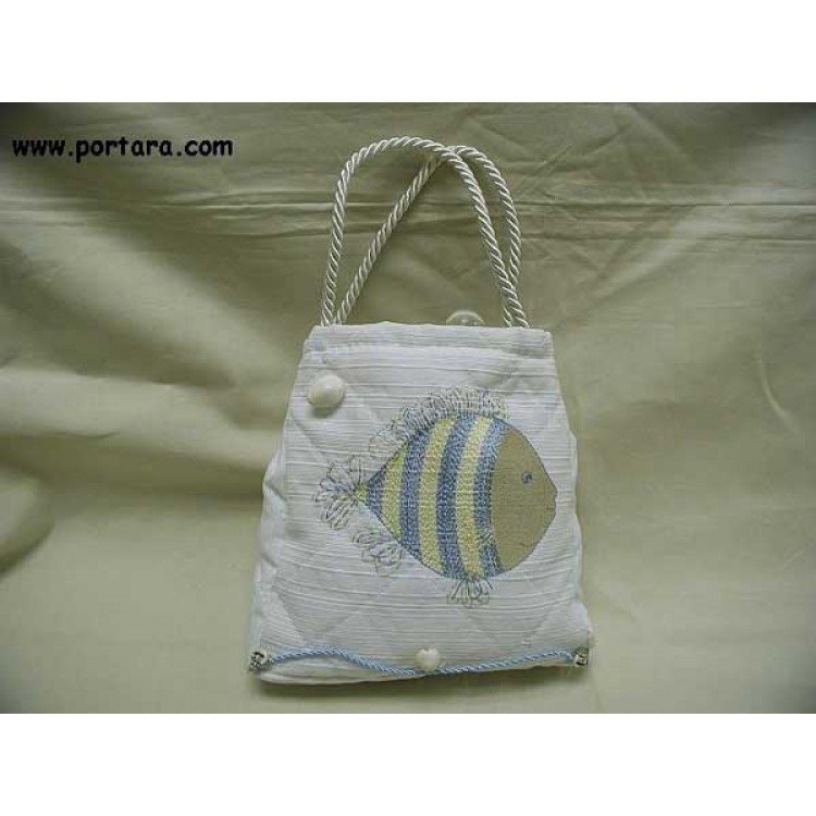 This is a lovely white fabric bag that includes all the little but main accessories a Christening ceremony needs. It is a beautiful bag with two rope handles on the top for easy handling and it is accented with an embroidered lught blue color fish and matching color ribbons and shells.
