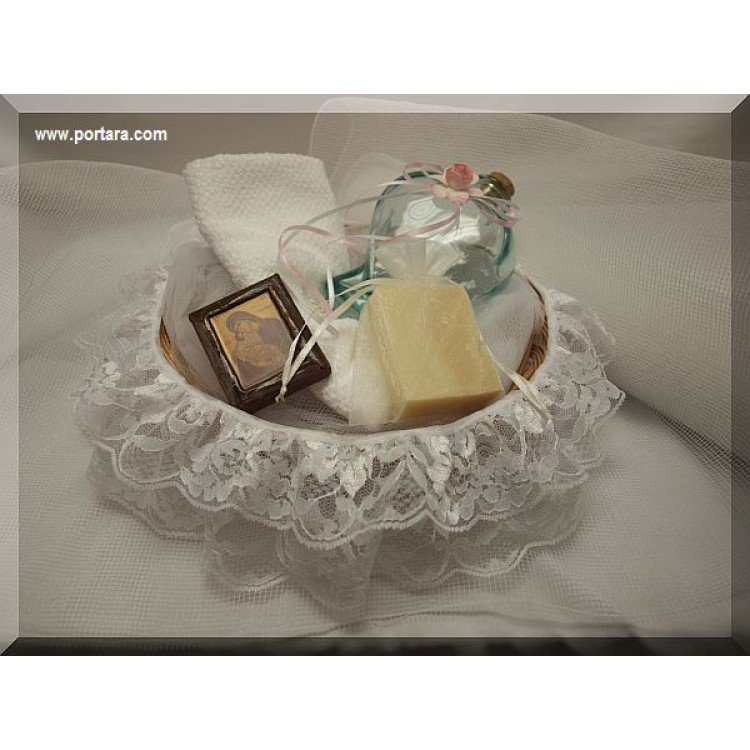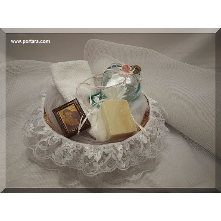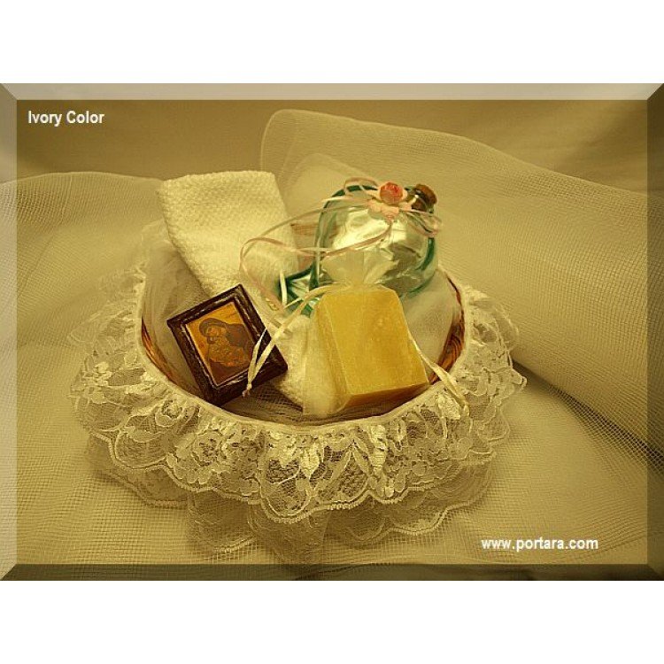 The basket contains 4 items: the baby soap inside an organza bag, the towel for the priest's hands wrapped beautifully with matching ribbons, the matching decorated bottle for the oil (or the Holy Water) and a wooden icon. The whole basket is further decorated uniquely with netting, beautiful ribbons and flowers that are available in many colors.