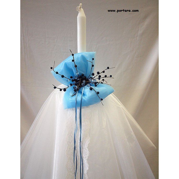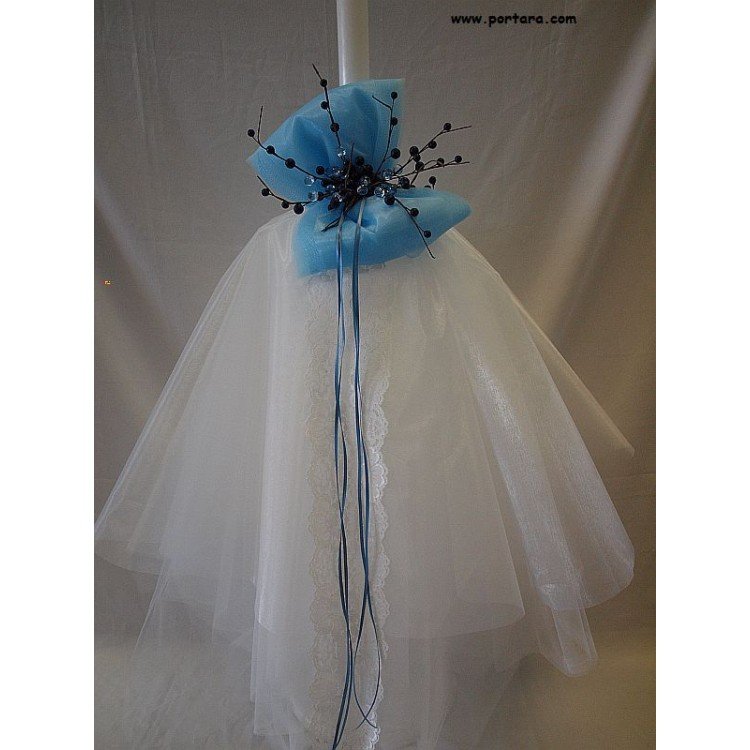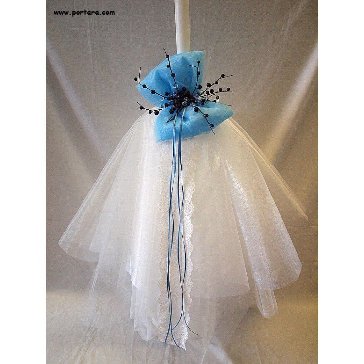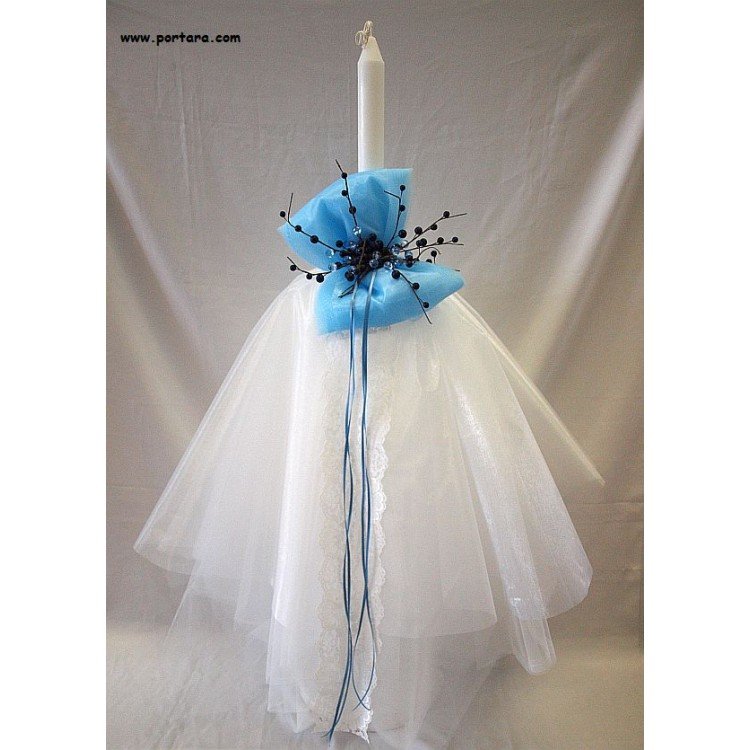 The candle is dressed with a few layers of soft white or ivory color tulle coming down in uneven ends. The outside then is covered by sheer organza fabric. The organza fabric covers 3/4 of the length of the candle in a cyclical ending, leaving the tulle to be shown underneath. The top of the candle is then decorated with a gorgeous sparkling bow that is tied in vertical downward position. Sparkling crystals embellish the bow further while wide lace and silky satin ribbons come down to the center of the design.
