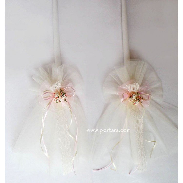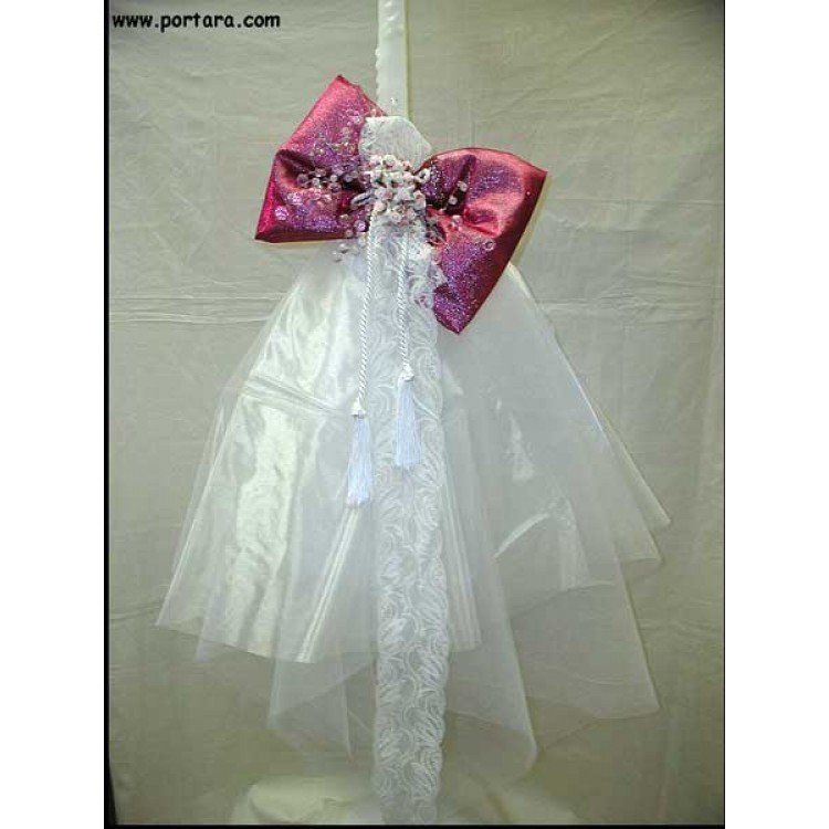 The candle is dressed in a few layers of soft white tulle coming down in uneven ends. The outside then is covered by sheer organza fabric. The organza fabric covers 3/4 of the length of the candle in a cyclical ending, leaving the tulle to be shown underneath. The top of the candle is then decorated with a gorgeous sparkling rose-wine color fabric bow that is tied in place in a crooked way that makes it appear bended to the right downward position. Sparkling clear and rose crystals along with pink porcelain flowers embellish the bow further while white tassels and wide lace ribbon come down to the center of the design.
