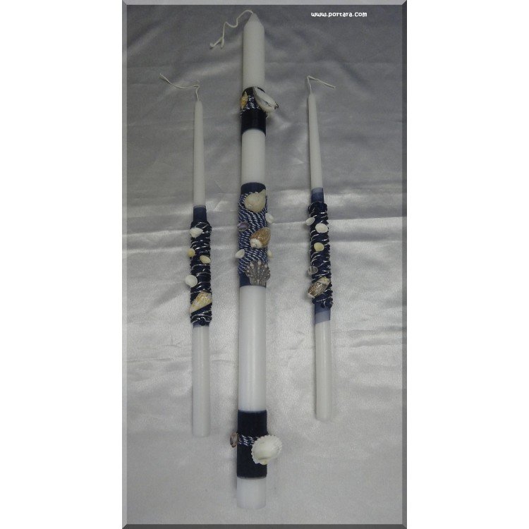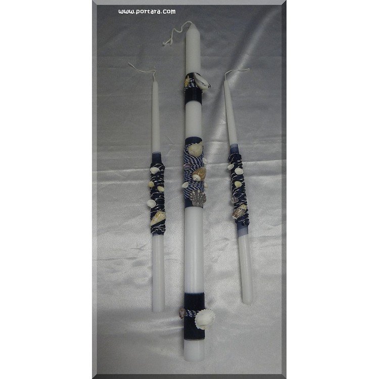 This is a lovely set of candles created with organza fabric on the bottom and rope ribbon on the top while the last touches are added with real seashells. Seashells vary in size and style.