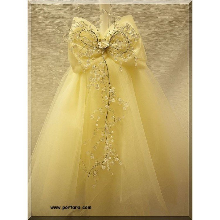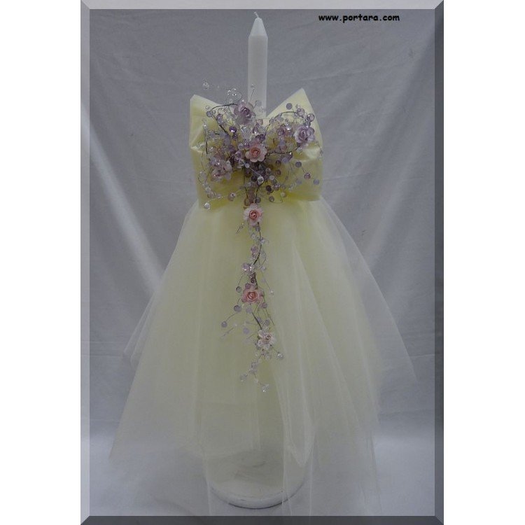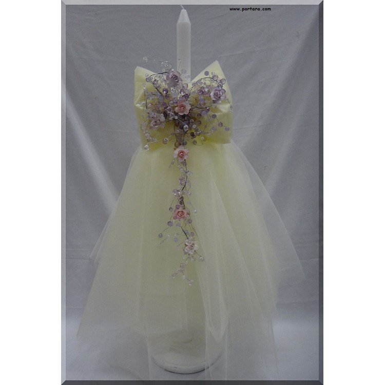 The whole candle is made of many layers of soft tulle coming down in uneven ends and creating lovely pointing endings evenly all around. The front of the candle is decorated with a matching color organdy bow that is accented with dazzling and adorable lilac/lavender crystals. Matching color flowers embellish the decoration further and add a unique color effect and beauty that stands out at a glance!