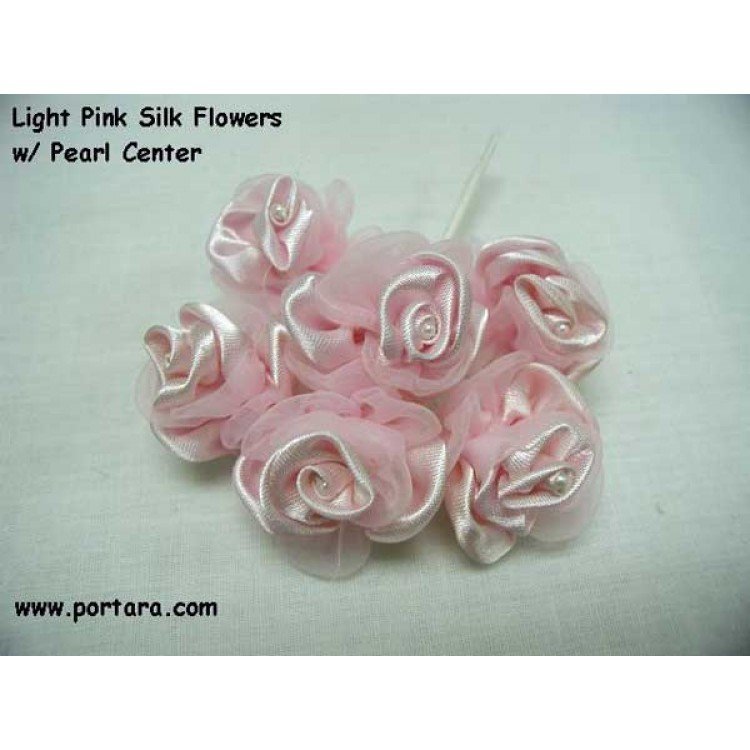 Luxurious bunch of 6 flowers of light pink color made of organza and silky satin fabric material with a pearl in the center. Flowers are of a good size; not mini but large.
