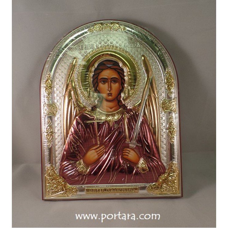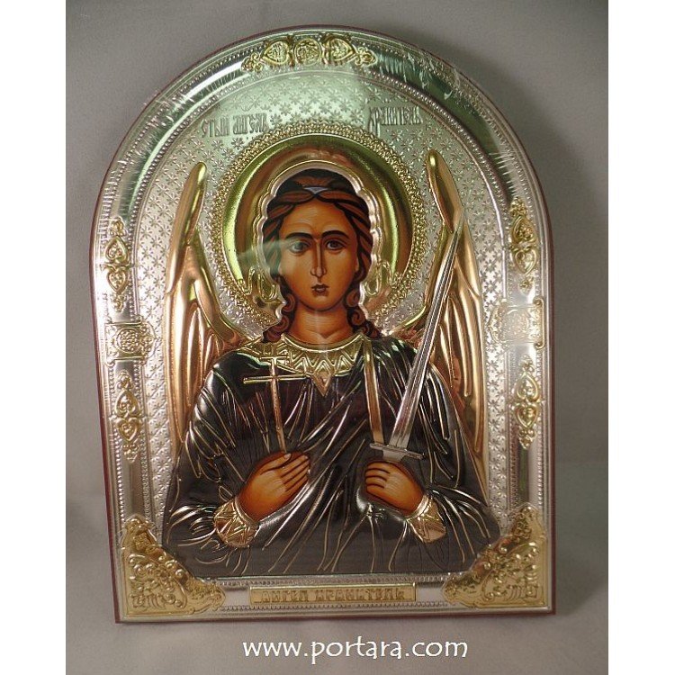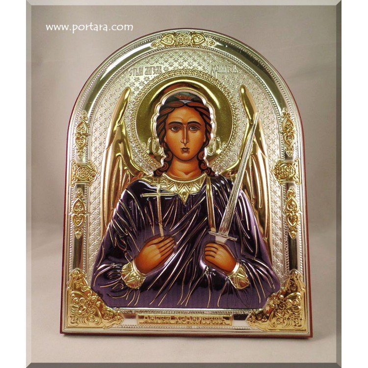 This beautiful Orthodox icon of Archangel Michael is a precise copy of old Byzantine icon artistically created. Made out of Silver 925 Degrees with Gold and Purple (Moss Green, Burgundy Red) accents and covered with special protective varnish. The certificate of its Authenticity is attached in the back of the icon.