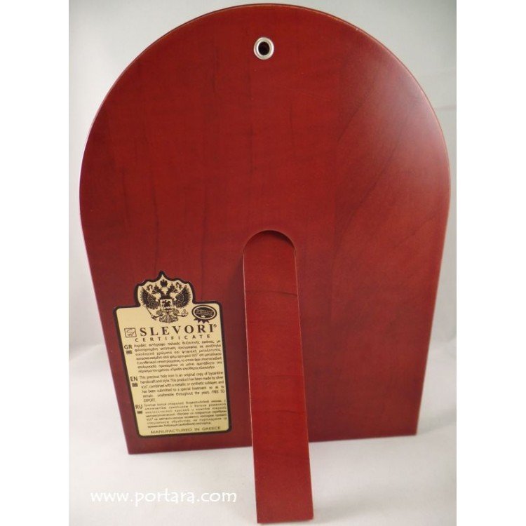 Icon is on Mahogany wood and can stand by iteself. Please look the detailed pictures below.