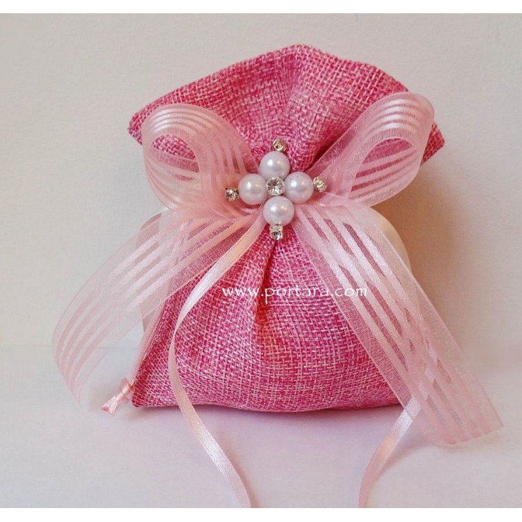 Faux linen favor bags, filled with 5 sugared almonds and further decorated with a beautiful organza bow, a hanging satin skinny ribbon, and a pearl cross with crystals.