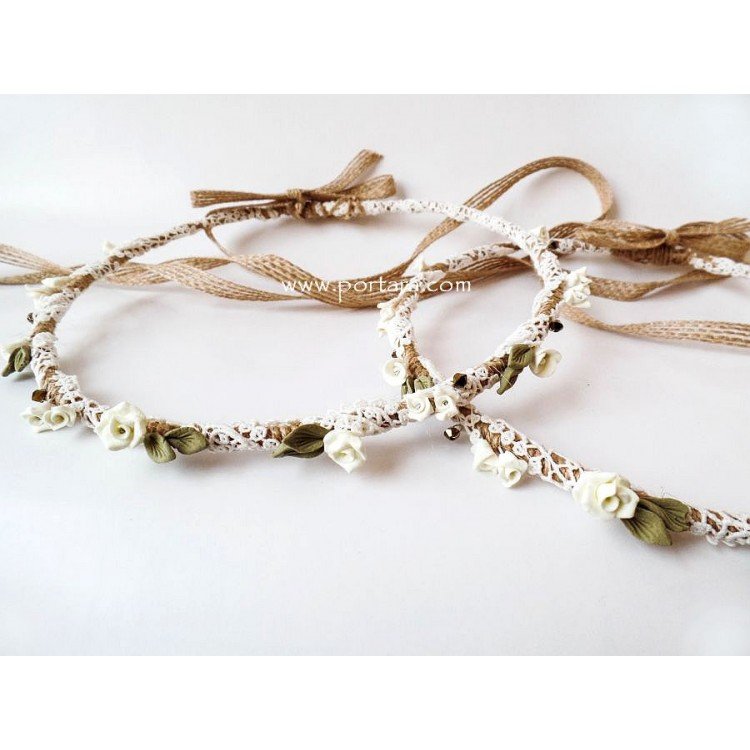 A colorful hand crafted pair of Greek Orthodox Wedding Crowns ~ Stephana that will impress with originality and beauty. This crowns have a natural look, achieved by the materials and colors used. They are tastefully decorated on a base of natural burlap rope wreath with a creamy color porcelain roses and sage green porcelain leafs. The crowns are also decorated with a white cotton crochet lace around accented with dark champagne or sage green color crystals(please specify below the color of crystals you like). It is an absolute beauty and originality!