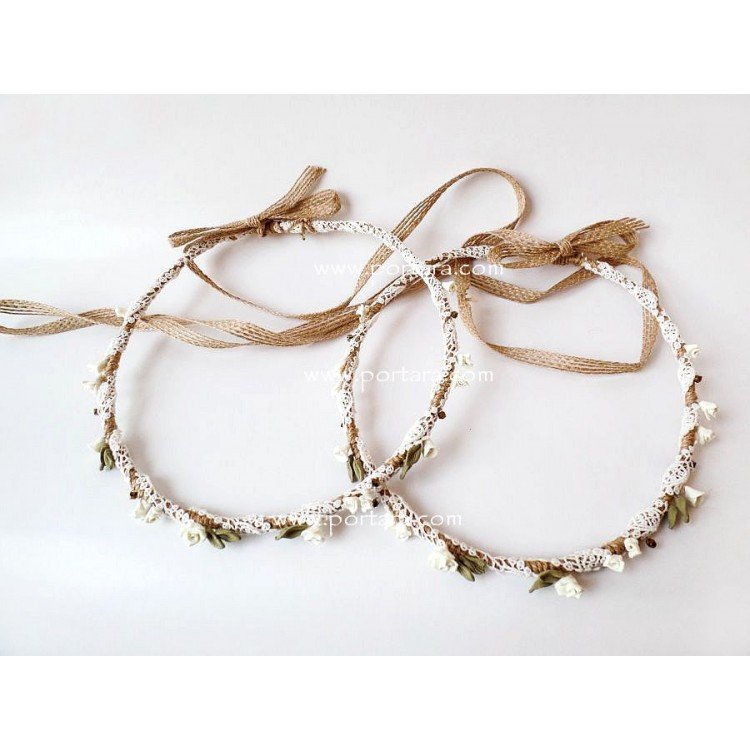 The two crowns are further connected with a matching natural burlap ribbon. Connecting ribbon could be changed to a different one. Please, specify inside the Comments box the color and material if you lake us to change the ribbon.