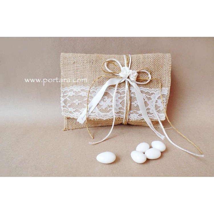 Natural color burlap envelopes decorated with lace, filled with 5 almonds and matching color rope color wrapped around that ties in a elegant bow accented with two creamy white porcelain roses in the middle.